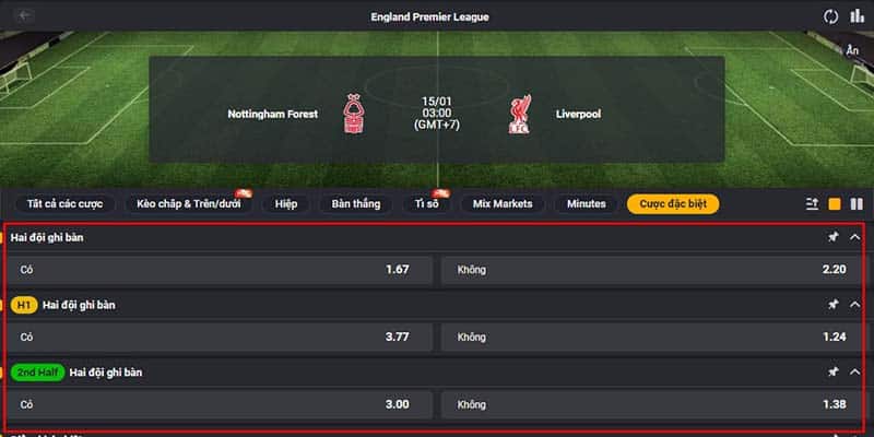 Với những trận cầu có tương quan thực lực một kiểu nhất định thì odds ăn một cửa sẽ rất thấp. Chẳng hạn như với trận cầu Nottingham gặp Liverpool dưới đây thì cửa Có ăn chỉ chưa tới 1.7. Đó là do nhà cái đánh giá đội quân của Arne Slot khó lòng để thủng lưới. Chính vì vậy, chơi từ đầu cũng dở, mà để khi một đội có bàn thì rate còn thảm hơn.